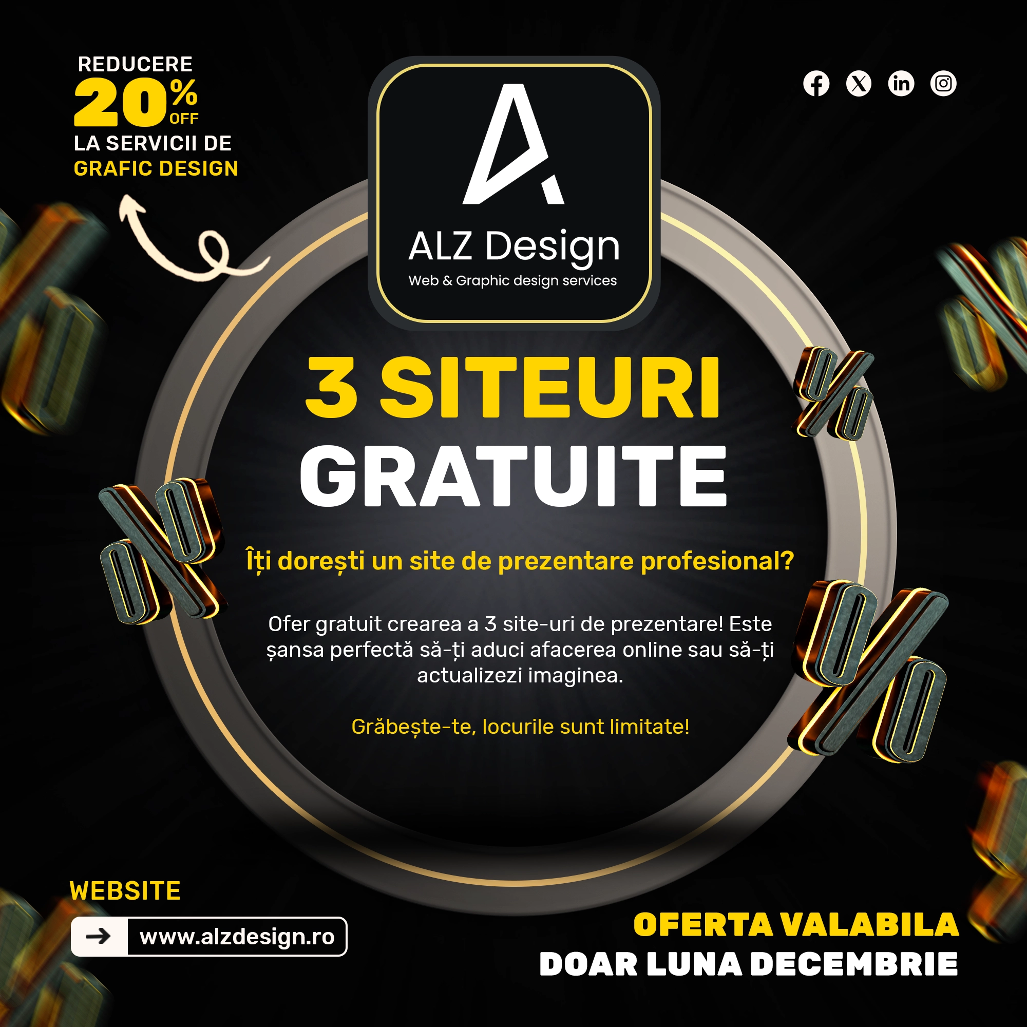 Ai nevoie de un site de prezentare profesional? ALZ Design îți oferă șansa de a obține gratuit unul dintre cele 3 site-uri disponibile! Crearea unui site de prezentare este esențială pentru a-ți aduce afacerea online și pentru a-ți îmbunătăți imaginea digitală.